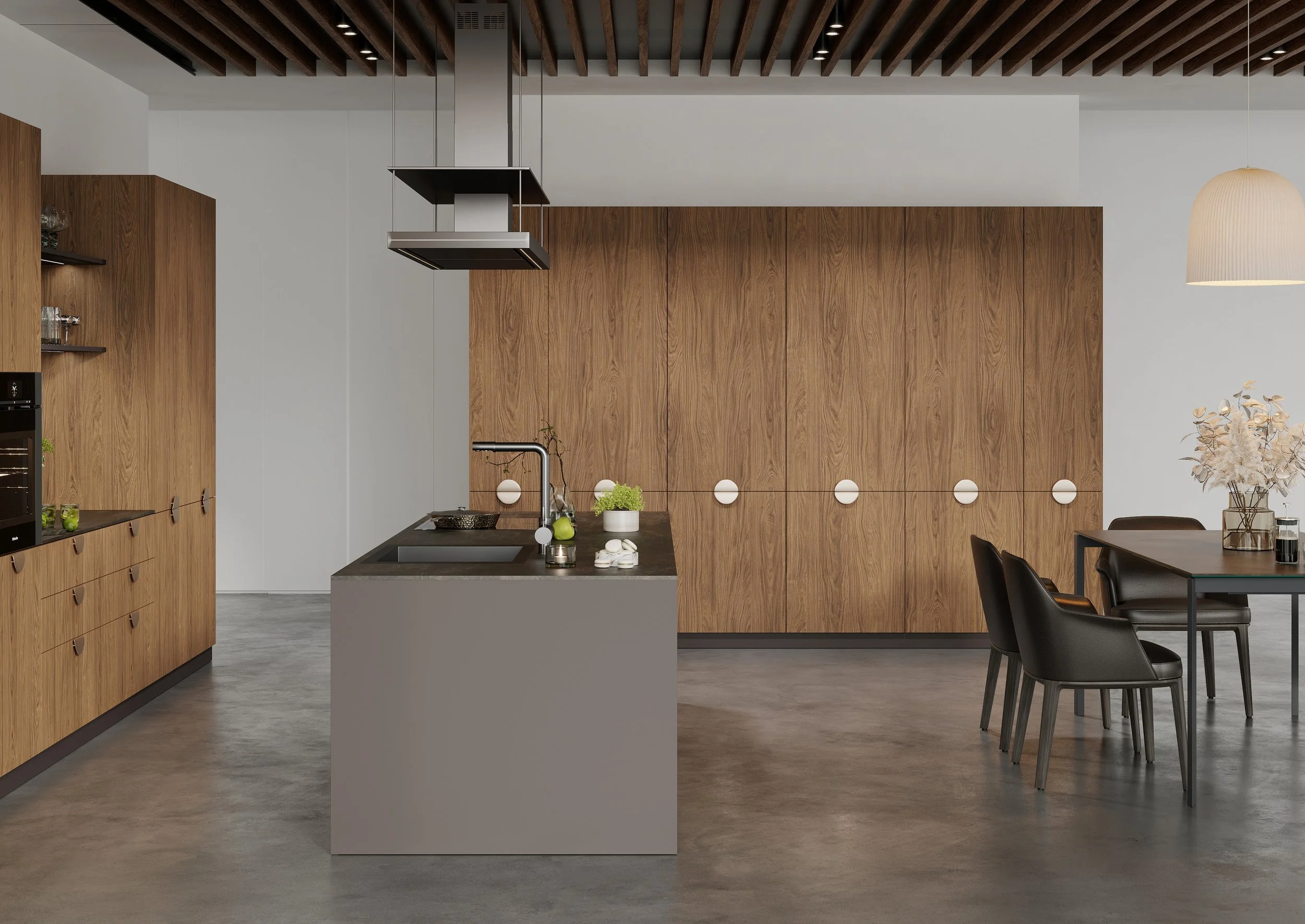Realistyczne aranżacje wnętrz — kuchnia w kontekście konkretnego pomieszczenia, ze światłem, dodatkami i wykończeniami.